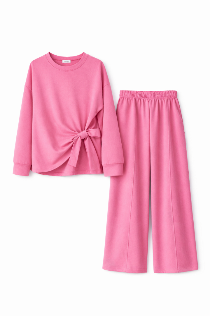 De Set strikdetail roze is een heerlijke tweedelige set die comfort en stijl perfect combineert.