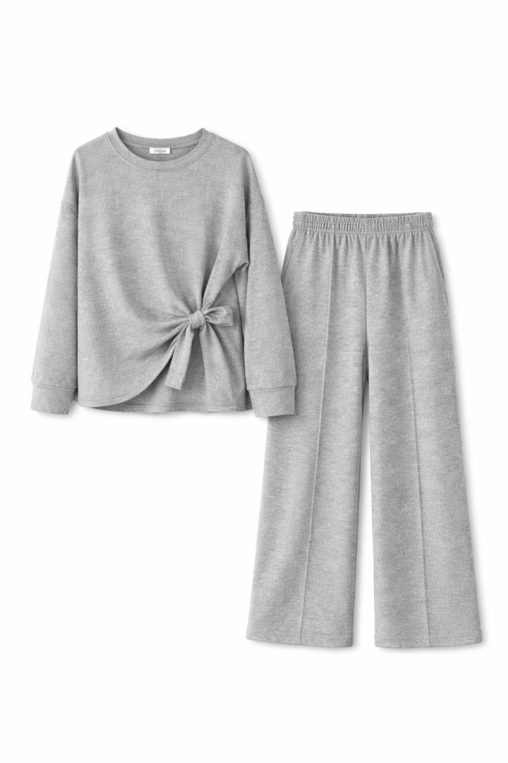 De Set strikdetail grijs is een comfortabele tweedelige dames set met een stijlvolle uitstraling.