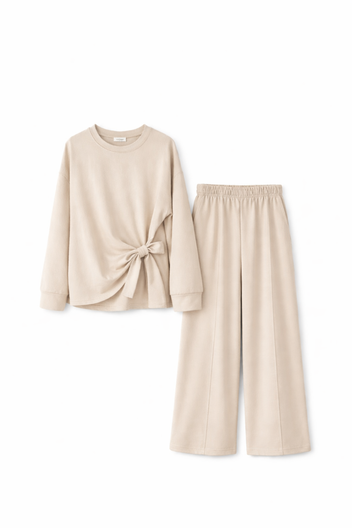 De Set strikdetail beige is een elegante en comfortabele tweedelige dames set die perfect past binnen een moderne, casual garderobe.