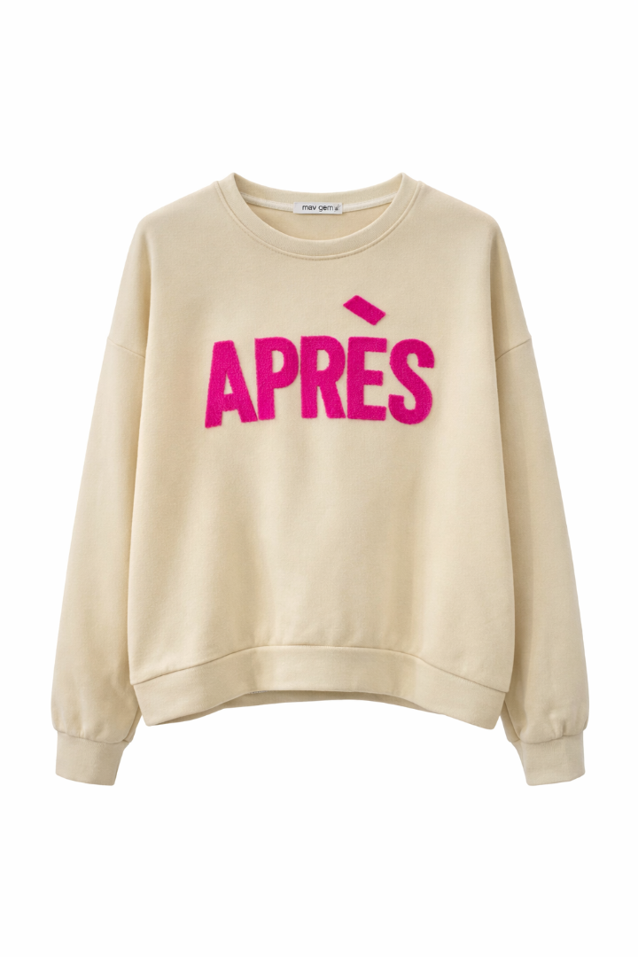 De Après-tekst op de voorkant is uitgevoerd in zachte 3D-teddystof met opvallende fuchsia roze kleur, wat het een speels en trendy accent geeft.
