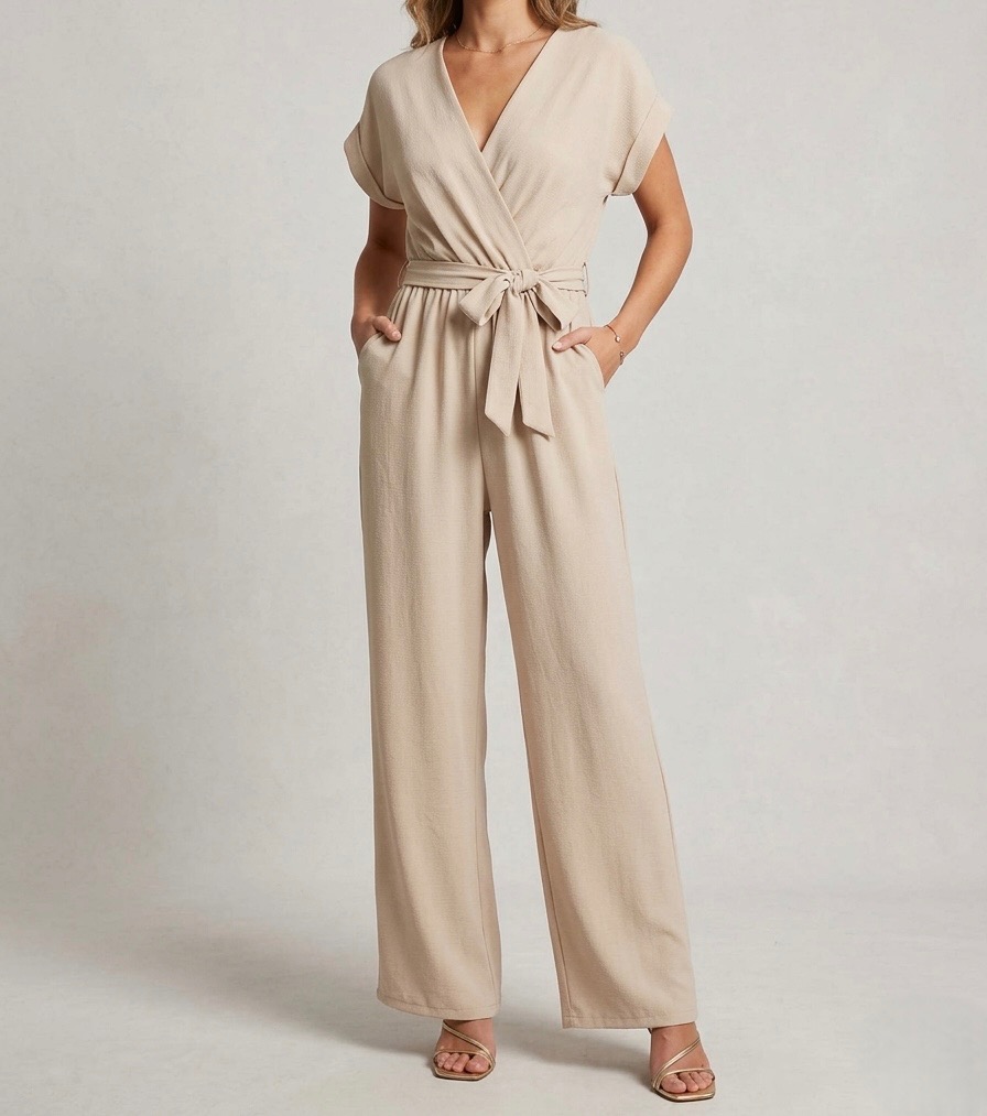 De jumpsuit heeft een elegante overslaghals die zorgt voor een vrouwelijke uitstraling.