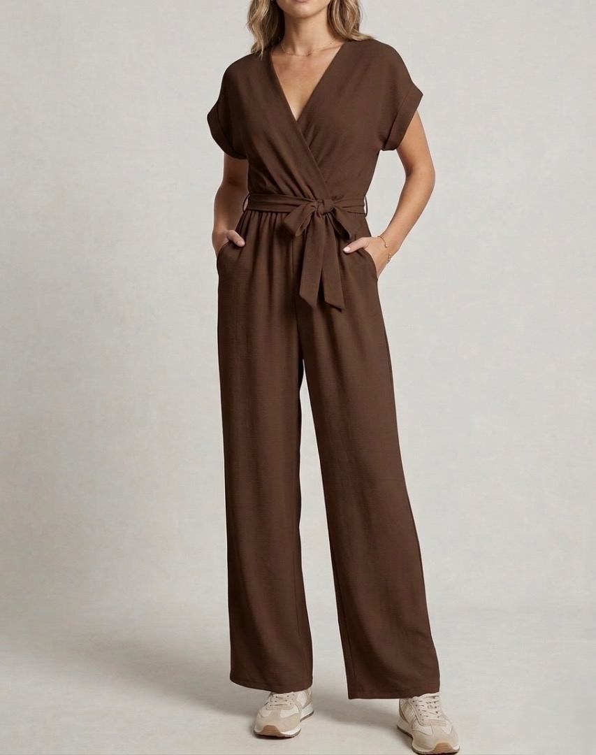 De jumpsuit heeft een elegante overslaghals die zorgt voor een vrouwelijke uitstraling.