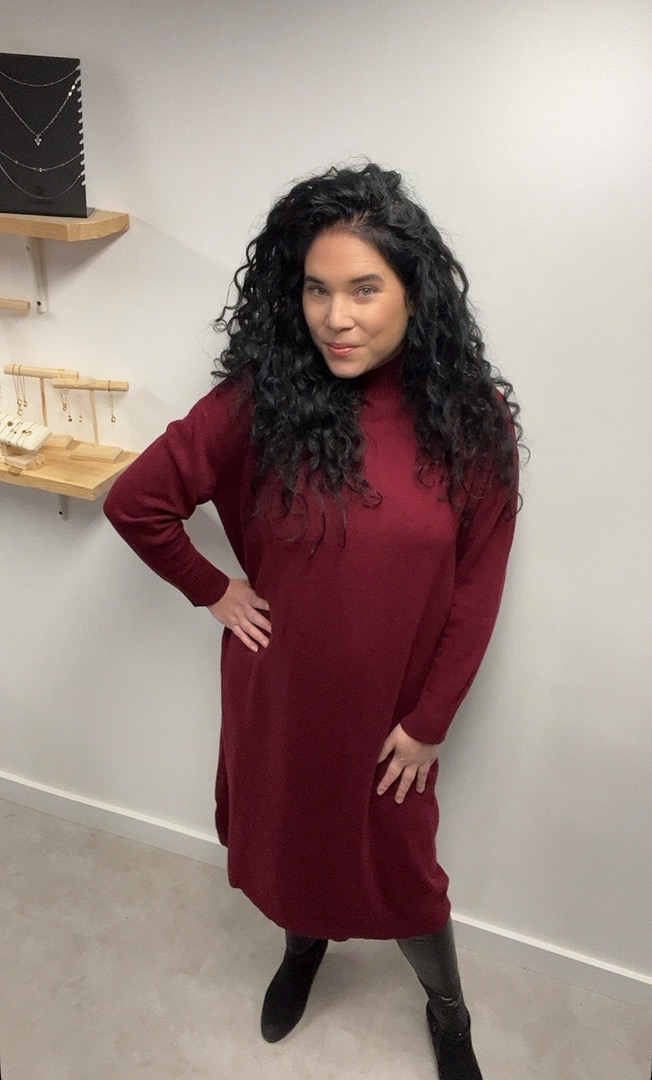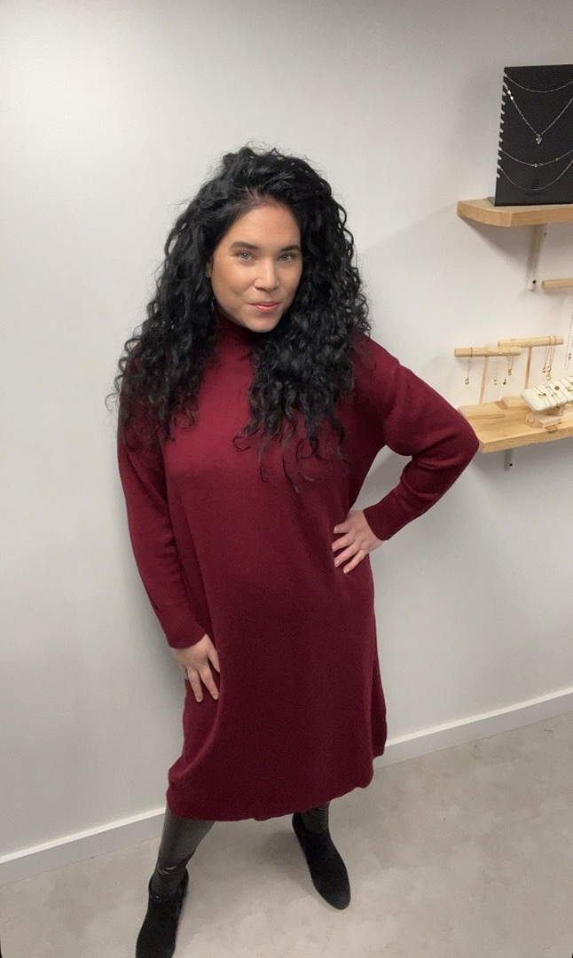 Deze prachtig fijn gebreide lange jurk bordeaux is het perfecte item voor de koudere dagen.