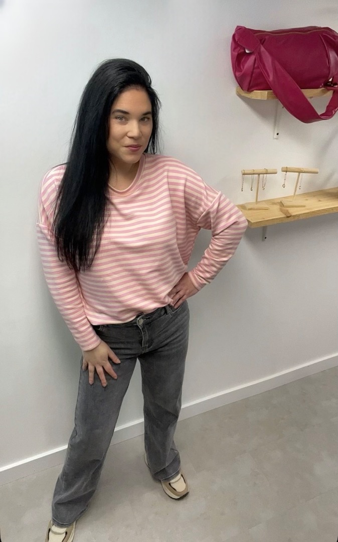 De Sweater roze beige gestreept is een frisse toevoeging aan je voorjaarsgarderobe.