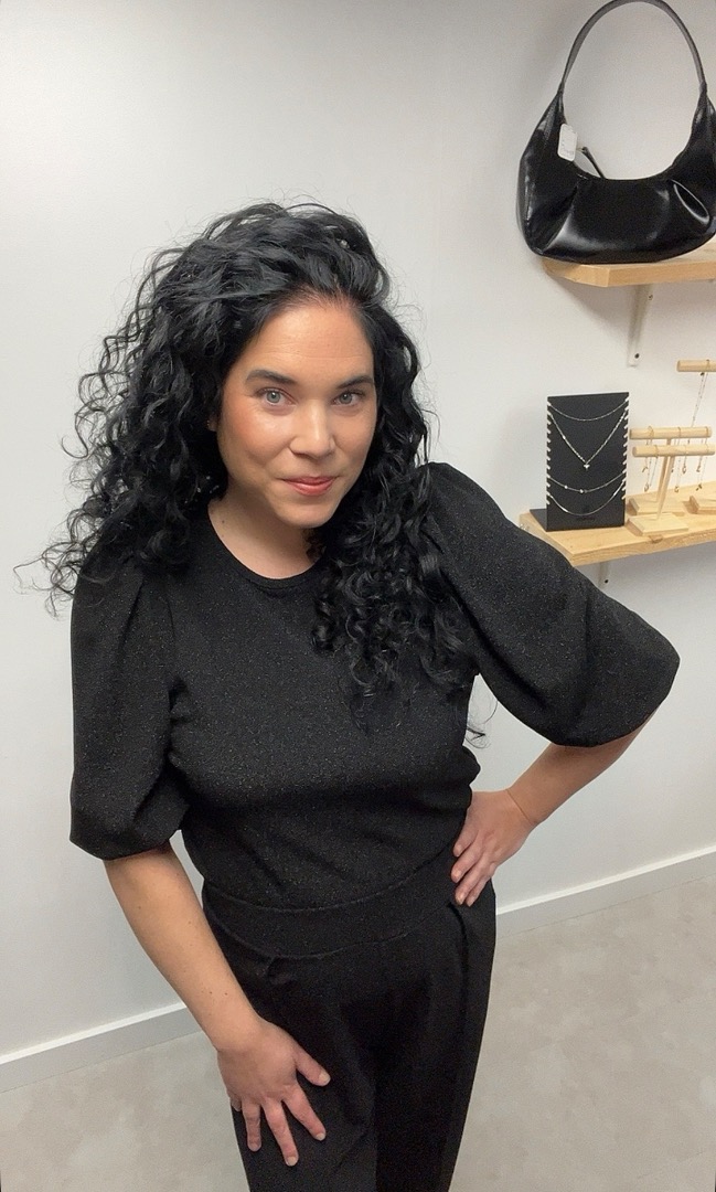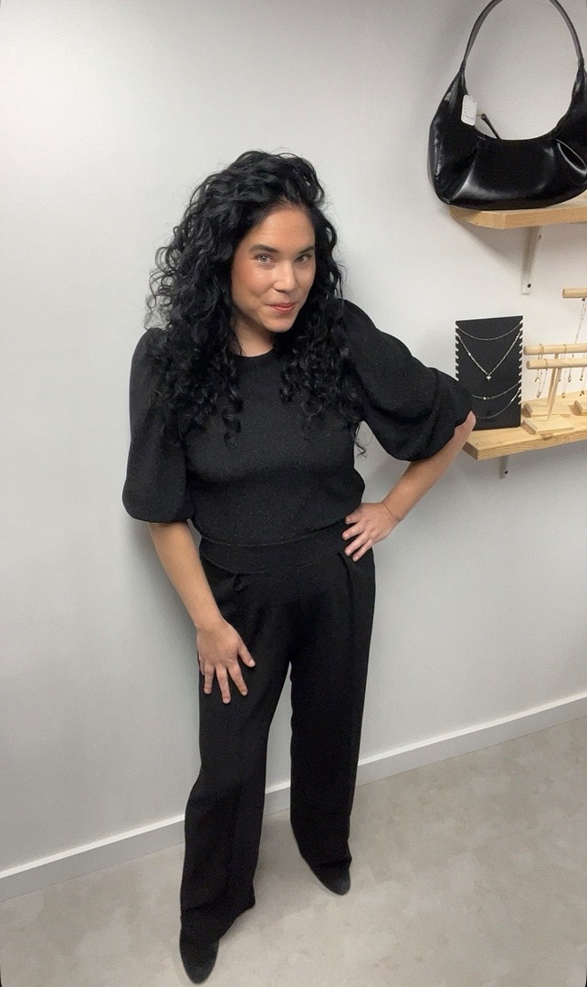 Combineer de top met de Wauw glitter broek zwart voor een complete, feestelijke set, of draag hem los met een mooie pantalon of jeans voor een stijlvolle avondlook.