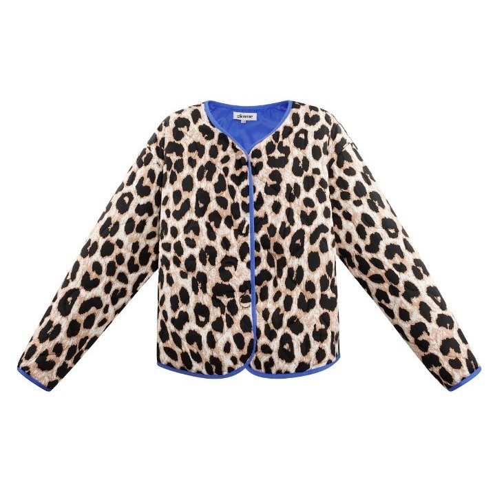 De Panterprint jas blauw sluit met knopen aan de voorkant en heeft opvallende blauwe biesranden langs de zoom en mouwen, wat een trendy twist geeft aan de klassieke panterprint.